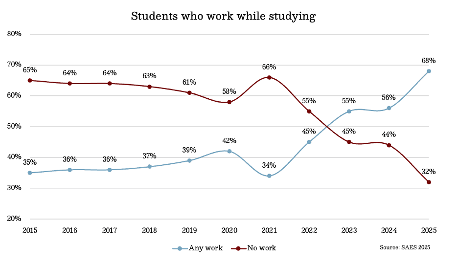 Against this backdrop, more students are being pushed into paid work for longer hours. While the average working student now undertakes 13.1 hours of employment per week, a level that may be manageable if carefully balanced, the distribution of working hours reveals a more concerning trend. Between 2022 and 2025, the proportion of students working more than 20 hours per week doubled from 5% to 10%, while the share of students not working at all fell sharply. Growth occurred across every working-hours band, indicating not only that more students are working, but that a growing minority are committing substantial time to employment.