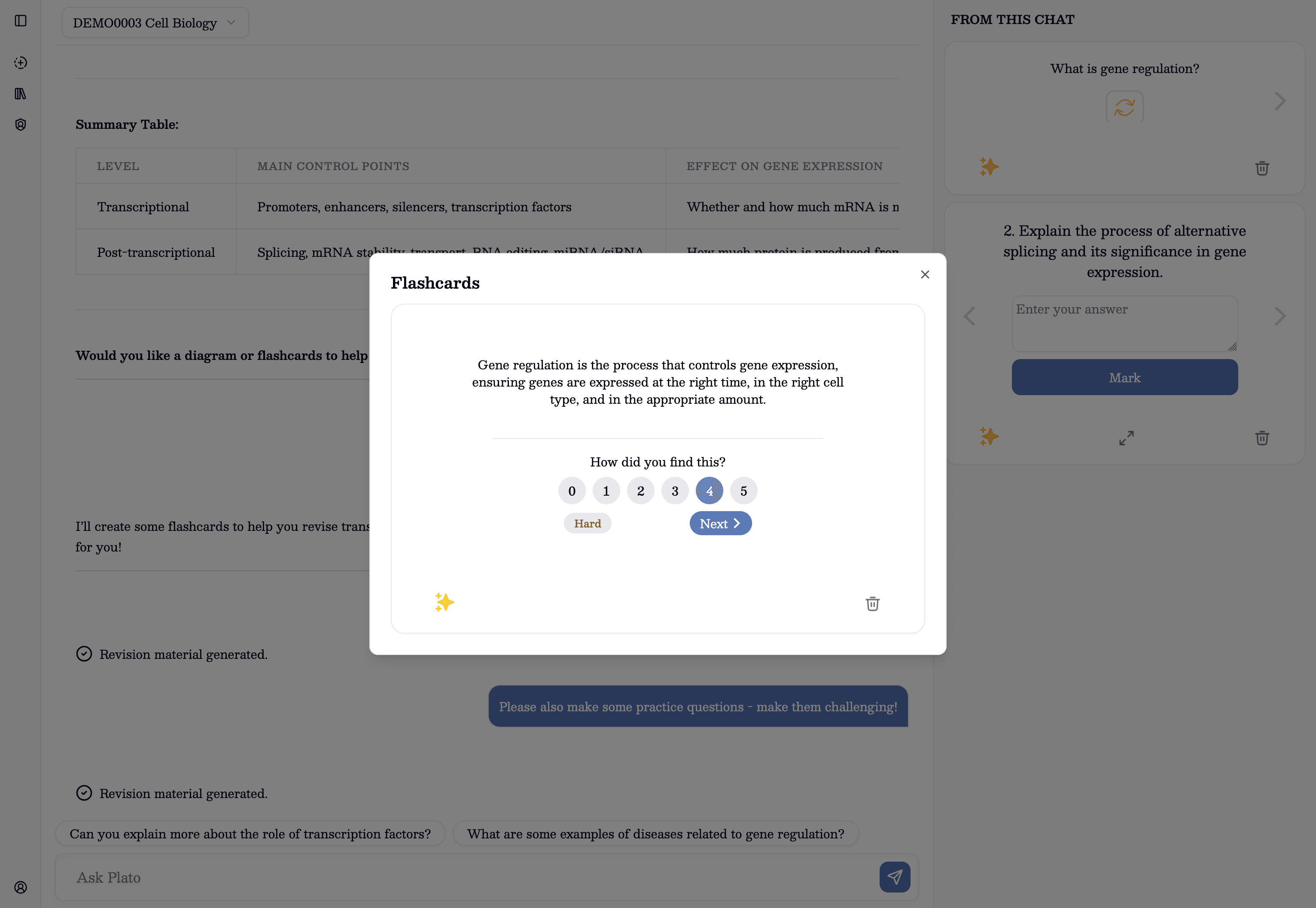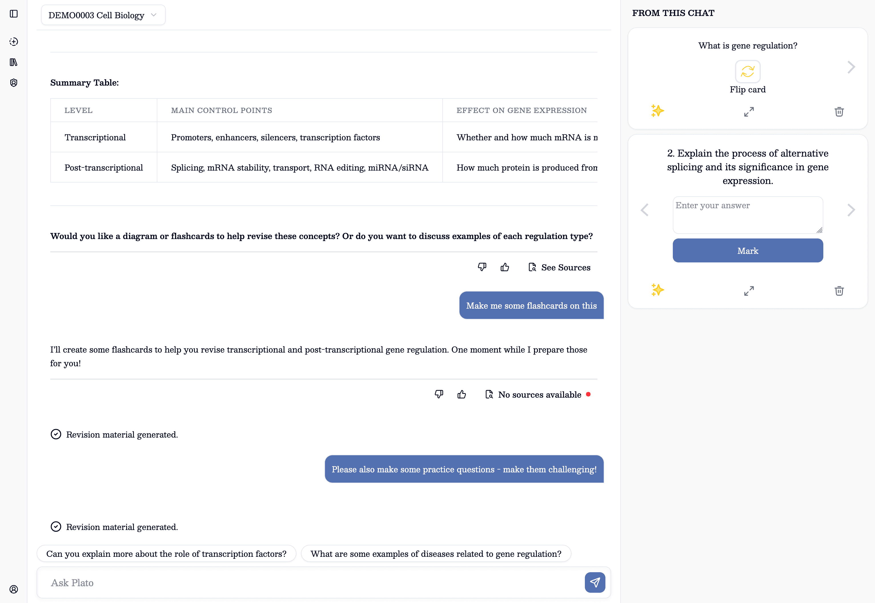 Plato helps students revise by automatically generating flashcards and practice questions from their course content. Flashcards highlight key concepts, while practice questions test understanding with immediate feedback - all designed to support active recall during revision.